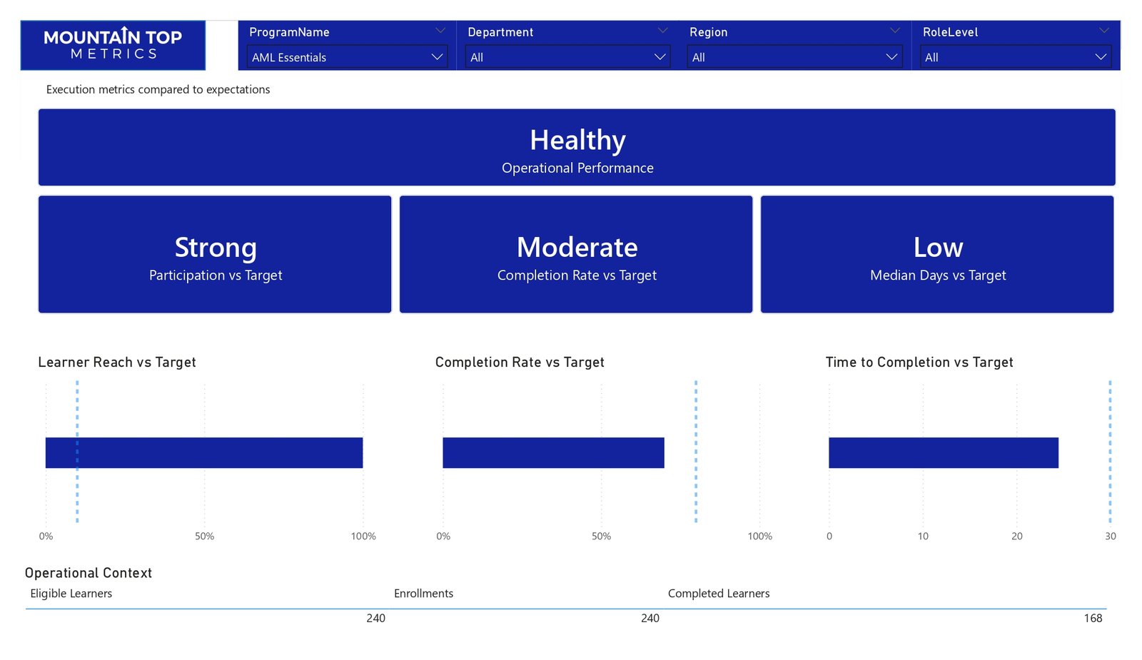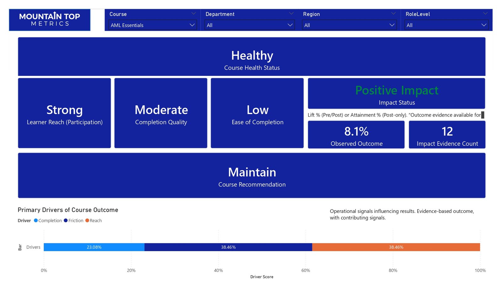 Mountain Top Metrics helps organizations connect the dots by leveraging a measurement system that tracks and compares multiple learning signals to deliver clear, executive-ready insights into course health and performance. These are actionable, data-driven recommendations on how to strategically move forward with a course or training.